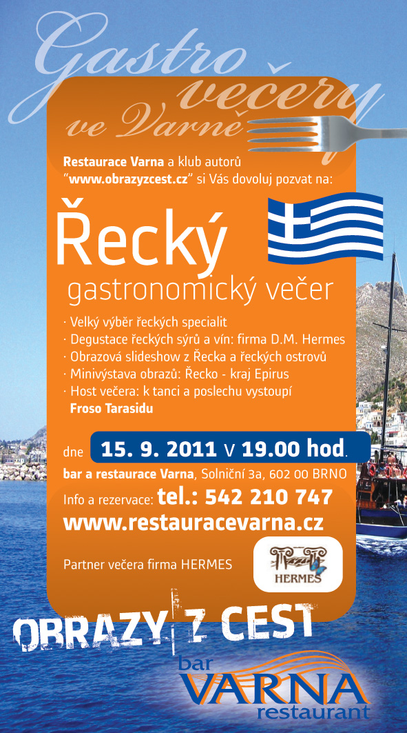 Restaurace Varna a galerie "Obrazy z cest" si Vás dovolují pozvat na Řecký večer, který se koná 15. 9. 2011 v 19:00 v restauraci Varna, Solniční 3a, Brno.