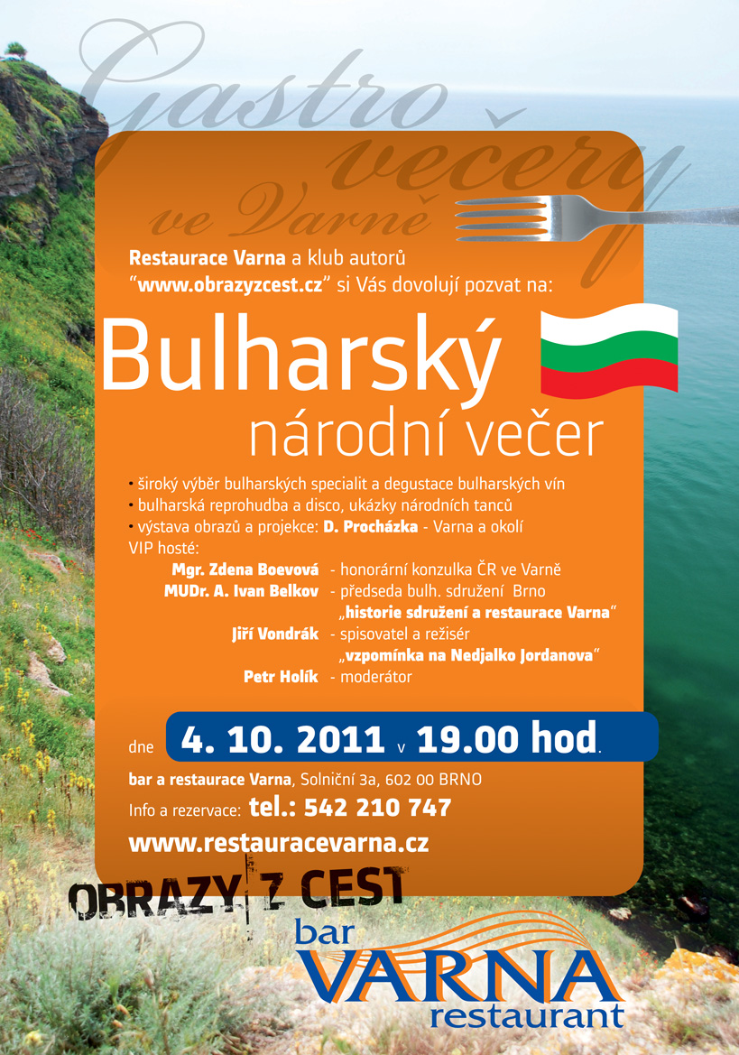 Restaurace Varna a galerie "Obrazy z cest" si Vás dovolují pozvat na Bulharský večer, který se koná 4. 10. 2011 v 19:00 v restauraci Varna, Solniční 3a, Brno.