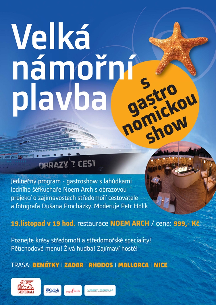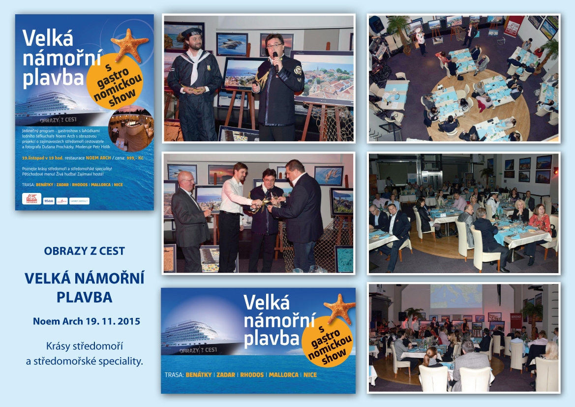 Vážení přátelé, dovoluji si Vás pozvat na jedinou atrakci v letošním roce „Velkou námořní plavbu a gastroshow v Noem arch“ Připomeneme si obrazem, gastronomickými specialitami, hudbou a zajímavými hosty atmosféru Středomoří. Toto jedinečné a unikátní představení volně naváže tím nejlepším na úspěšné partyshow z let 2013 a 2014, kdy jsme představili 27 destinací.